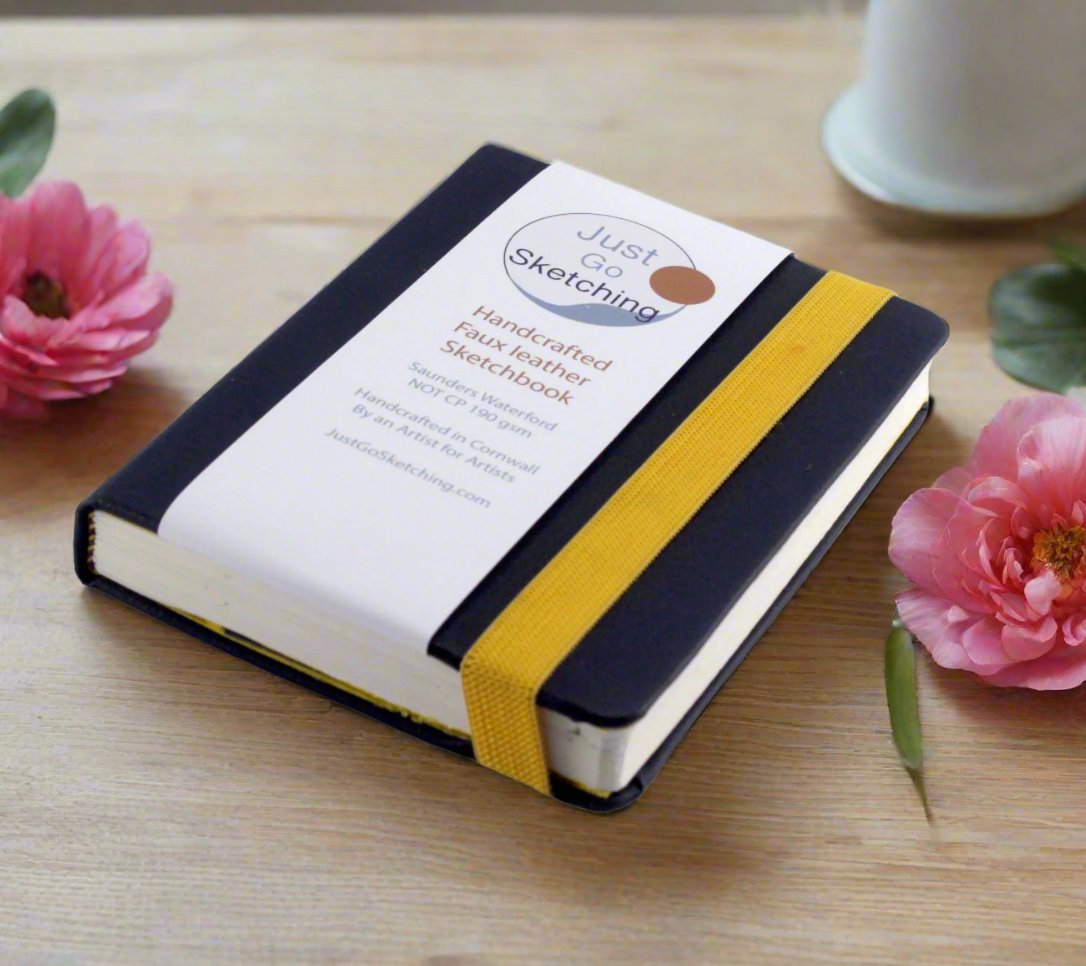 This handmade JustGoSketching sketchbook features a soft-touch faux leather or a water-resistant cover from the 'Garden' collection. It contains 190gsm T.H. Saunders Waterford watercolour paper, making it ideal for both dry and wet sketching or journaling. You have the option to customise the cover, inside pages, and elastic pencil holder colours. Each sketchbook includes rounded corners, a wide elastic binder, and a secret pocket, providing a unique and creative companion made with care.