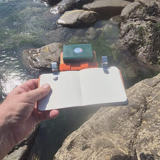 You no longer need to balance your sketching kit. Everything is held in place with magnets, forming a solid working space that can be picked up and put down in one go. The sketching companion comes with 6 half pans of high-quality handmade paints and a 24-page sketchbook with rounded corners, complete with a hard cover and elastic wrap. Half pan paints, 3 cool and 3 warm colours, 2 reds, 2 yellows, 2 blues
