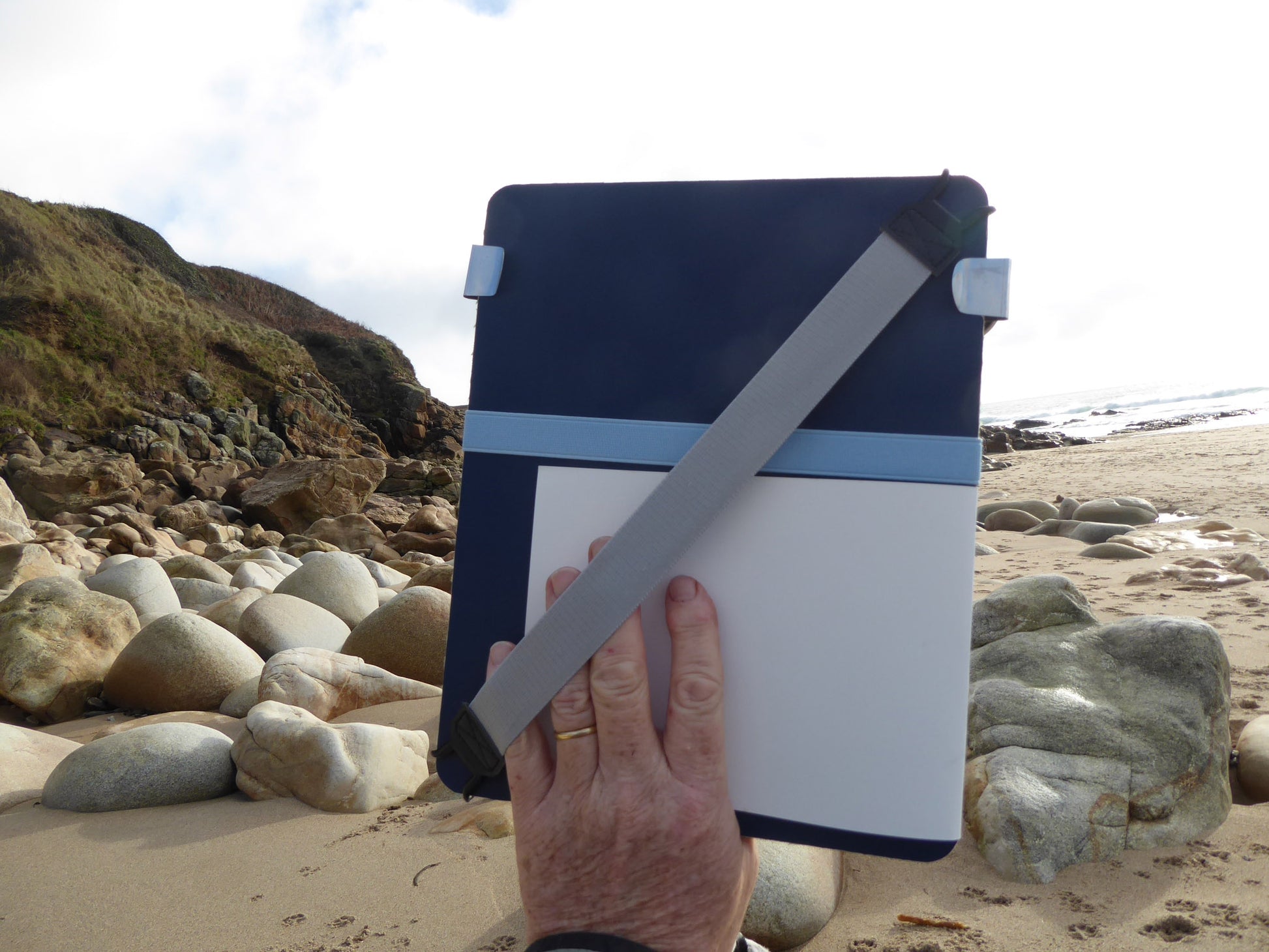 I have designed the sketching support in a way that follows the one-handed sketching principle. It is based on the concept of a drawing board, but it is more practical, tactile, robust and visually appealing. The JustGoSketching support is versatile as it can be used in landscape or portrait mode, and it works for both left and right-handed use.